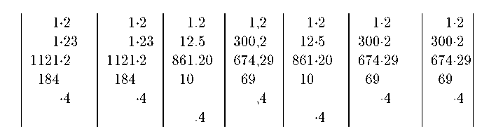 \begin{tabular}{|d{-1}|d{2}|.|,|d{3}|d{4}|d{1}|}